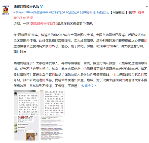 据西藏网警巡查执法官方微博消息,近期,一则“魏伟健失物招领”的信息在微信群中流传。