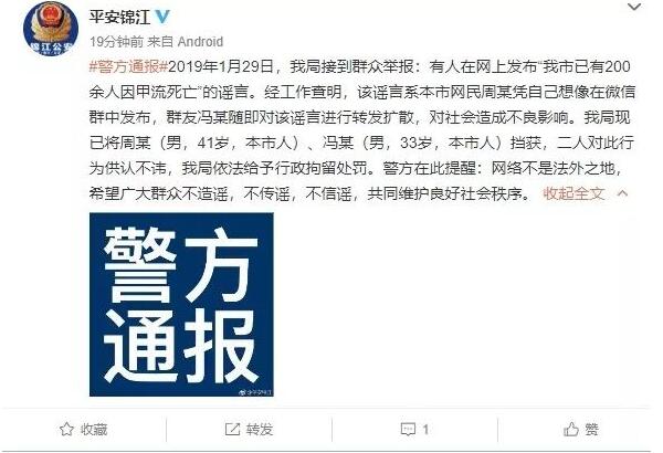 1月30日,成都公安局锦江分局发布通报:周某、冯某因在网上发布“成都市已有200余人因甲流死亡”谣言被依法行政拘留。