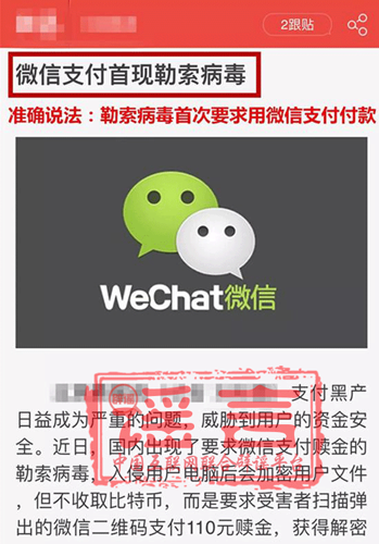 【传言】12月初有传言称“微信支付出现勒索病毒”, 大家纷纷担心自己的微信会中招。