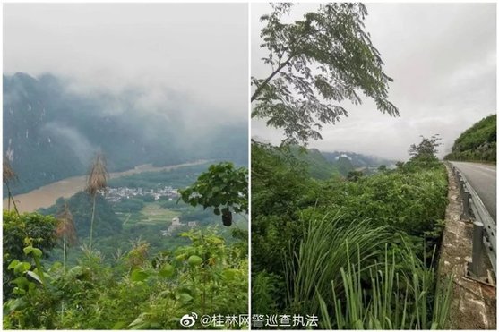 该信息出现后,阳朔警方高度重视,民警立即到达西塘公路路段进行核实情况,图为今日西塘公路情况,路况良好,并未发生山体滑坡。