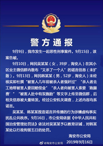 9月10日,网民吴某某(女,39岁,海安人)在其小区业主微信群内散布“又杀了一个人”的谣言信息(未扩散)。9月13日,网民韩某某(男,52岁,海安人)未经核实即杜撰“被害人几年前被杀人者强奸过”“杀人者去工地帮被害人要回赔偿金”“杀人者向被害人索要‘跑腿费’”“被害人肚中有双胞胎”等文字上传至微信群后相关信息被大量转发。经过公安机关调查,上述内容均系谣言。(@海安市公安局)