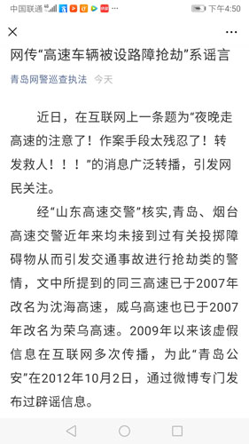 原标题:山东辟谣|青岛境内高速夜间有人专设路障抢劫?别信!10年前就传过