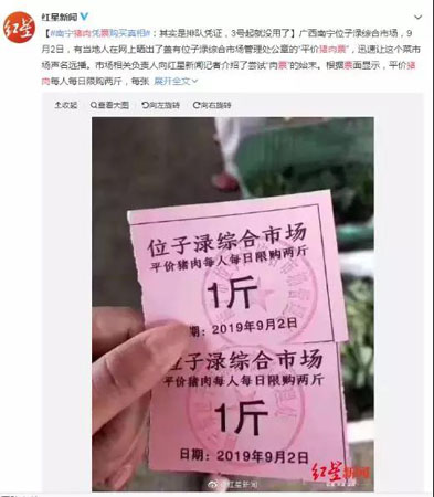 早在9月初,广西南宁一市场就曾发过猪肉票——每张票可以购买1斤平价猪肉,每人两张,意味着每人每日限购两斤。