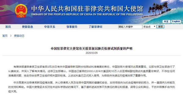 真相:3月29日,中国驻菲律宾大使馆官网发布《中国驻菲律宾大使馆有关援菲新冠肺炎检测试剂质量的声明》一文回应,经菲律宾卫生部确认,中国迄已援菲的2000人份华大基因和10万人份圣湘核酸检测试剂盒质量非常好,不存在任何准确度问题,完全符合世界卫生组织相关国际标准。