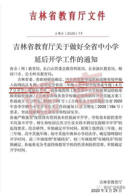 近日,一份《吉林省教育厅关于做好全省中小学延后开学工作的通知》在网络流传。“通知”显示:因吉林省新型冠状病毒肺炎境外输入病例高达5例,故原定全省高三年级4月7日开学,现延后开学。