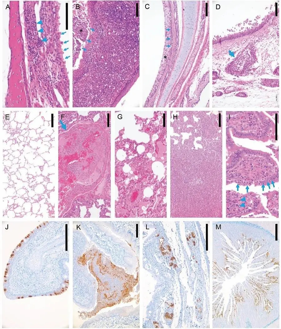 组织病理学观察证实,病毒感染猫可引起不同程度的肺脏炎症与肠道粘膜损伤;免疫组化研究发现上呼吸道(鼻腔、上颚、扁桃体)粘膜上皮及嗅球细胞、气管及支气管粘膜黏液腺上皮细胞、小肠粘膜上皮等部位存在大量病毒感染。