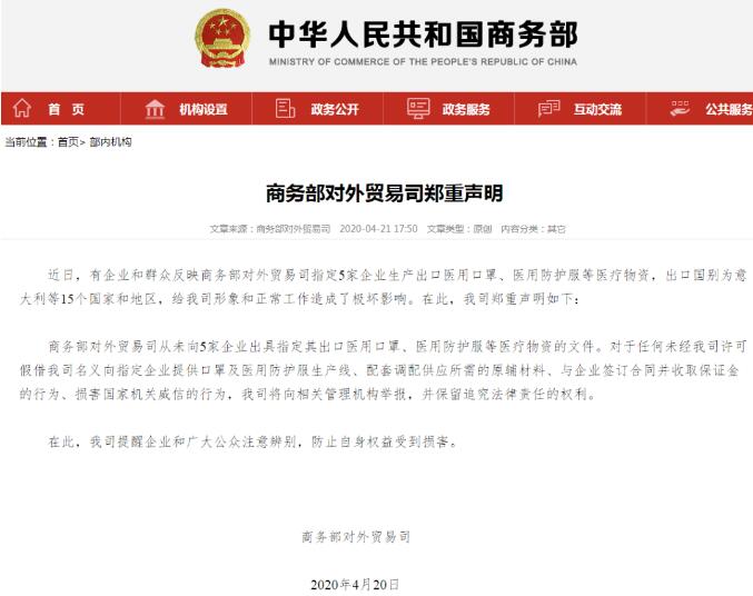 真相:近日,有企业和群众反映商务部对外贸易司指定5家企业生产出口医疗物资。对此,商务部对外贸易司发布声明称,商务部对外贸易司从未向企业出具指定其出口医用口罩、医用防护服等医疗物资的文件。对外贸易司将向相关管理机构举报,并保留追究法律责任的权利。