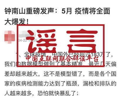 真相:近日,多个网络账号转发“钟南山:5月疫情将全面爆发”等“标题党”文章,引起大量关注。经查证,钟南山院士未在任何公开平台上预测过“5月疫情将全面爆发”。
