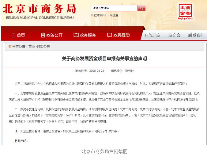真相:近期,有企业反映一些社会机构声称可以代企业申请北京商务发展资金,并收取一定费用或提成。对此,北京市商务局4月24日发布声明称,北京商务发展资金项目申报不收取任何费用。