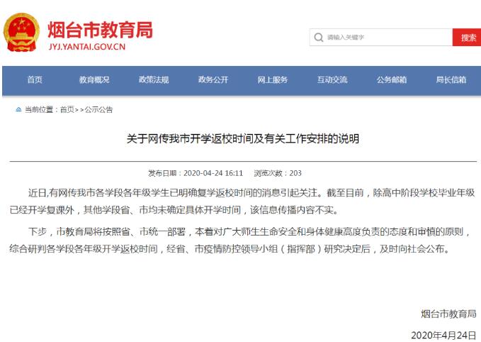 真相:4月24日,烟台市教育局于其官网发布辟谣声明称,截至目前,除高中阶段学校毕业年级已经开学复课外,其他学段省、市均未确定具体开学时间,该信息传播内容不实。