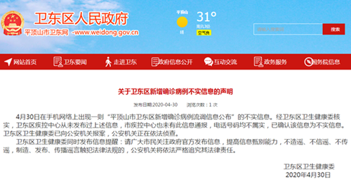 4月30日,平顶山市卫东区卫生健康委发布“关于卫东区新增确诊病例不实信息的声明”,声明表示: