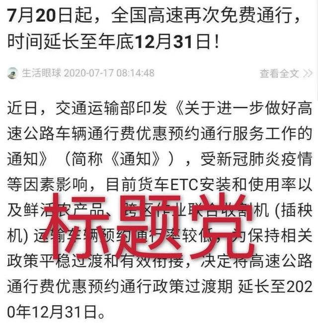 近日,网传《7月20日起,全国高速再次免费通行,时间延长至年底12月31日》,有不少网友留言求证。