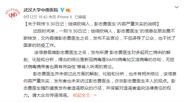 12日7时许,@武汉大学中南医院 发布情况说明,称这段耸人听闻的文字,实则是假借彭志勇医生之名的不实言论,不但误导了公众,也干扰了国家的防疫工作。