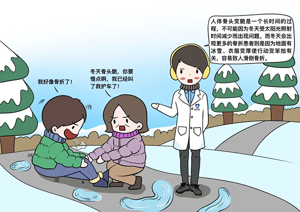 天冷时很多人出门运动少,受太阳光照射时间也少,的确会影响到钙、磷的正常吸收和骨化作用,体内钙质流失较大,但这不表示就会导致人体骨骼在冬天变脆。人体骨骼变脆是一个长时间渐变的过程,不可能只因为受太阳光照射时间减少而出现。冬天会出现更多的骨折患者,是因为地面变硬或有冰雪、衣服变厚而使人行动变笨拙,从而更容易致人滑倒。