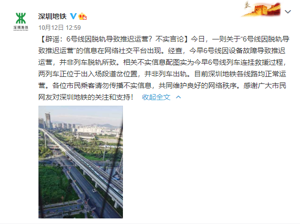 12日早间,网传“深圳地铁6号线因脱轨导致推迟运营”。据深圳地铁官方微博消息,地铁6号线因设备故障导致推迟运营,并非列车脱轨所致。网传配图实为6号线列车连挂救援过程,两列车正位于出入场段道岔位置,并非出轨。