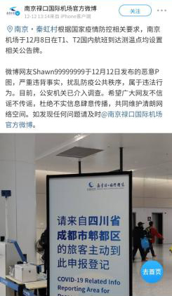 12日,一张写有“请来自四川省成都市的旅客原路返回”和“南京禄口国际机场”字样的图片在网上流传,引起众多网友关注。