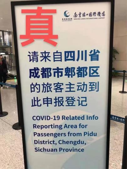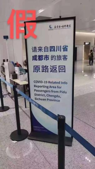 当天中午,南京禄口机场通过官方微博辟谣,网传图片内容实为谣言,并已经向公安机关报案。据机场贴出的现场真实照片,牌子上显示内容为“请来自四川省成都市郫都区的旅客主动到此申报登记”。(记者 申冉)