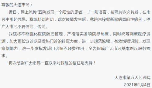 近日,网上流传“五院发现一个阳性的患者……”一则谣言,被网友多次转发,在市民中引起恐慌。大连市第五人民医院特此声明,此次疫情发生后,我院未接收新冠病毒阳性病例,望广大市民不要信谣、传谣。