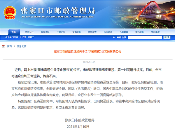 张家口市邮政管理局关于全市寄递服务正常运转的公告