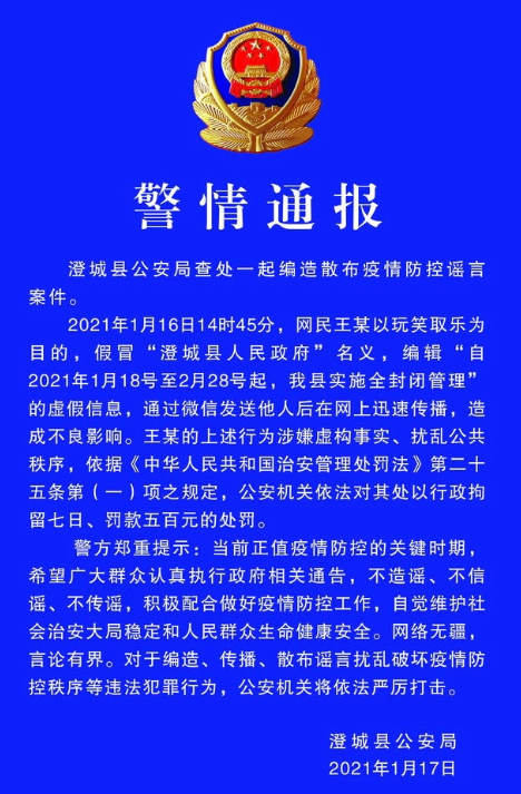 记者从陕西渭南澄城县公安局了解到,2021年1月16日14时45分,网民王某以玩笑取乐为目的,假冒“澄城县人民政府”名义,编辑“自2021年1月18日至2月28日起,我县实施全封闭管理”的虚假信息,通过微信发送他人后在网上迅速传播,造成不良影响。王某的上述行为涉嫌虚构事实、扰乱公共秩序,依据《中华人民共和国治安管理处罚法》第二十五条第(一)项之规定,公安机关依法对其处以行政拘留七日、罚款五百元的处罚。