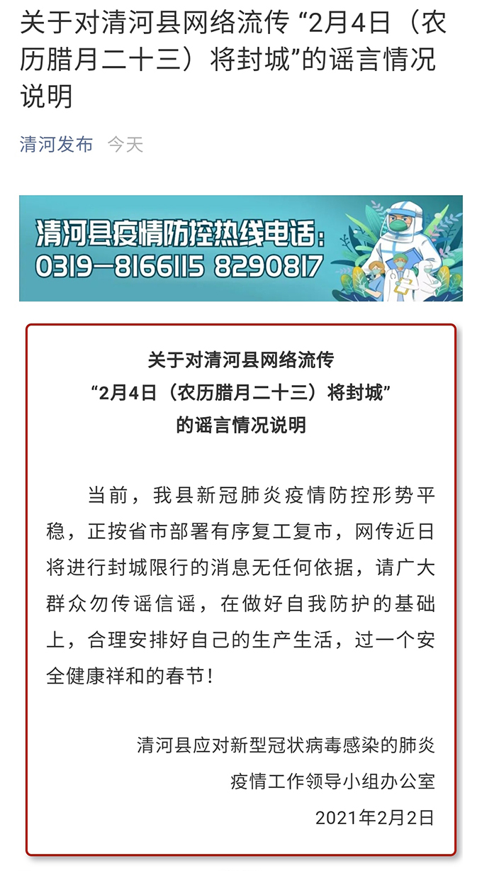据河北邢台市清河县委员会宣传部官方微信消息,清河县应对新型冠状病毒感染的肺炎疫情工作领导小组办公室2日发布一则情况说明。说明指出,网络流传的清河县近日将进行封城限行的消息无任何依据,请广大群众勿传谣信谣。