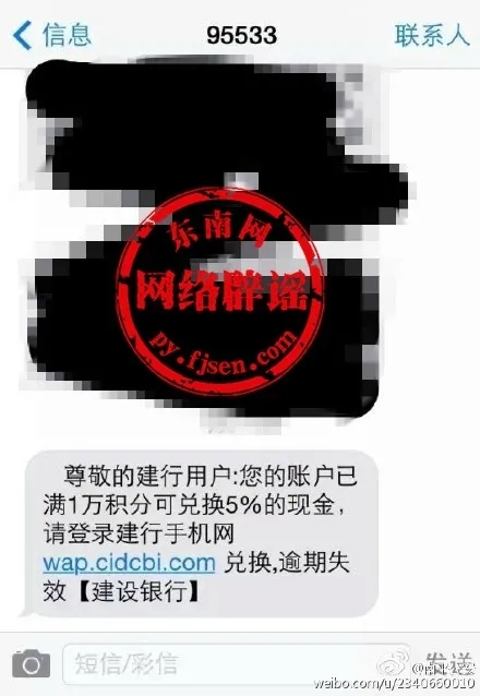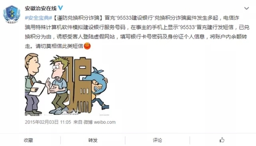 2015年安徽治安在线曾提醒:电信诈骗用特殊计算机软件模拟建设银行服务号码,在事主的手机上显示”95533“冒充建行发短信,以兑换积分为由,诱惑受害人登陆虚假网站,填写银行卡号密码及身份证个人信息,将账户内余额转走。请切莫相信此类短信。