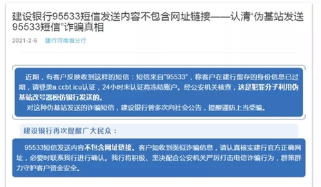 2021年2月6日,建行河南省分行提醒:这类骗局是犯罪分子利用伪基站改号器模仿银行发送的。95533短信发送内容不含网址链接。