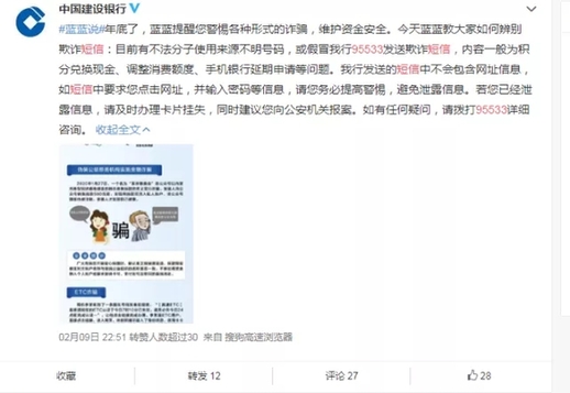 2021年2月9日, 中国建设银行官方微博表示:如短信中要求您点击网址,并输入密码等信息,请您务必提高警惕,避免泄露信息。