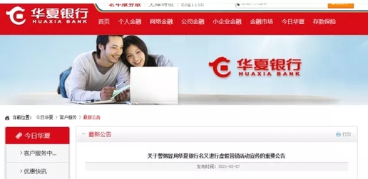 2021年2月7日,华夏银行股份有限公司在其官方网站发布《关于警惕冒用华夏银行名义进行虚假营销活动宣传的重要公告》进行辟谣。华夏银行股份有限公司强调,该虚假宣传涉及的营销活动非我行开展的营销活动。请广大客户不要轻信虚假宣传内容,切勿扫描页面中的二维码下载相关APP,以防被骗。