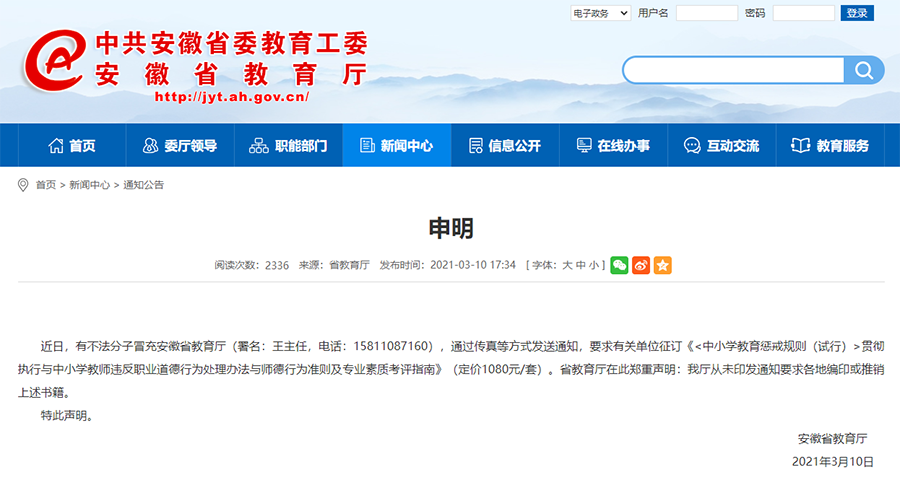 近日,有不法分子冒充安徽省教育厅(署名:王主任,电话:15811087160),通过传真等方式发送通知,要求有关单位征订《<中小学教育惩戒规则(试行)>贯彻执行与中小学教师违反职业道德行为处理办法与师德行为准则及专业素质考评指南》(定价1080元/套)。省教育厅在此郑重声明:我厅从未印发通知要求各地编印或推销上述书籍。