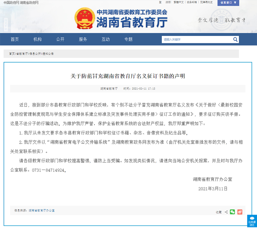 近日,接到部分市县教育行政部门和学校反映,有个别不法分子冒充湖南省教育厅名义发布《关于做好〈最新校园安全防控管理制度规范与学生安全保障体系建立标准及突发事件处理实用手册〉征订工作的通知》,要求征订购买该手册。这是不法分子的行骗活动。为维护我厅声誉,保护全省教育系统的合法财产权益,湖南省教育厅郑重声明如下: