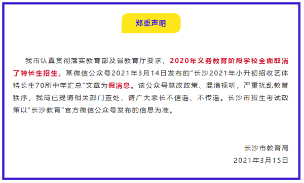 长沙市认真贯彻落实教育部及省教育厅要求,2020年义务教育阶段学校全面取消了特长生招生。某微信公众号2021年3月14日发布的“长沙2021年小升初招收艺体特长生70所中学汇总”文章为假消息。该公众号篡改政策、混淆视听,严重扰乱教育秩序,长沙市教育局已提请相关部门查处,请广大家长不信谣、不传谣。长沙市招生考试政策以“长沙教育”官方微信公众号发布的信息为准。