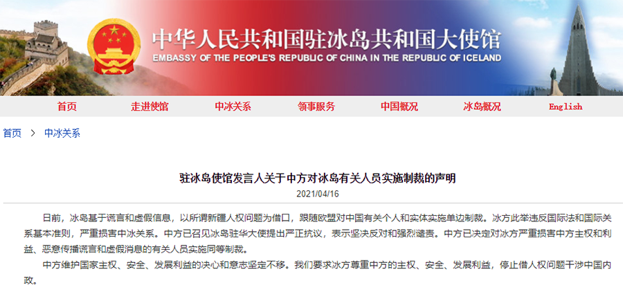 16日,中国驻冰岛大使馆官网发布驻冰岛使馆发言人关于中方对冰岛有关人员实施制裁的声明:
