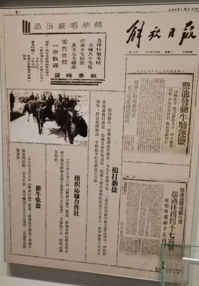 1943年8月,盐池驻军创造性地提出了用牛驮盐的方式,不仅解放了当地公盐义务运输队员的双手,更是极大地提高了运输效率,38头牛一次往返可赚边币68000元!据不完全统计,从1938年到1943年,从盐池运出的食盐约12.5亿公斤。盐池所产池盐除了满足边区需求,还为边区换来了急需的各类物资。盐池的食盐不仅打破了国民党的经济封锁,活跃边区经济贸易,更是支援了伟大的抗日战争。