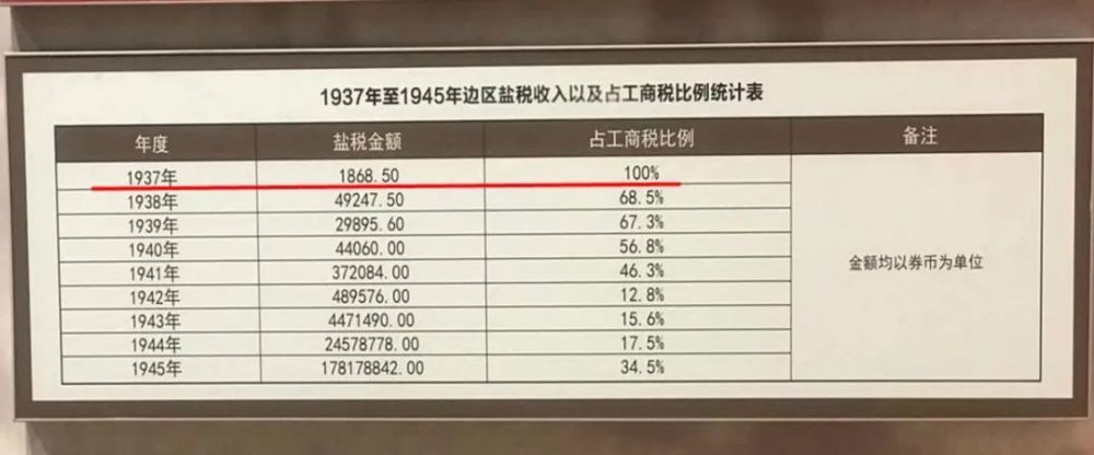 1937年至1945年边区盐税收入以及占工商税比例统计表