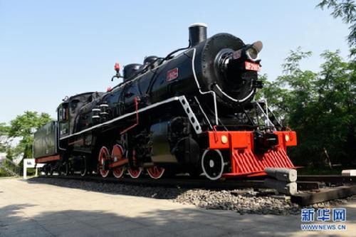 在中车青岛四方机车车辆股份有限公司厂区里,停放着新中国第一台国产火车头“八一号”(6月8日摄)。新华社发(中车青岛四方机车车辆股份有限公司供图)