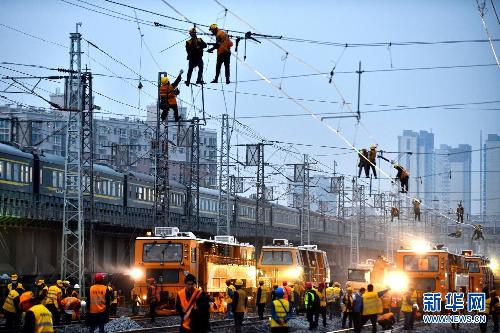在胶济铁路黄台站,中铁十局的工作人员在进行胶济铁路至济青高铁联络线黄台站改施工作业(4月12日摄)。新华社记者 郭绪雷 摄
