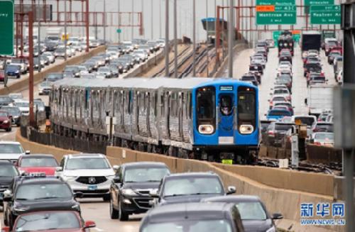 5月6日,在美国芝加哥,一列挂有7000系列车厢的地铁列车载客试运行。中国中车青岛四方机车车辆股份有限公司(中车四方)在美国制造组装的7000系列地铁车厢4月21日在芝加哥开始载客试运行。新华社发(乔尔·莱纳摄)