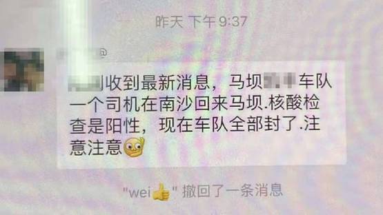 6月12日,韶关市公安局曲江分局通过网上巡查,发现有网民通过微信群转发“刚刚收到最新消息,马坝xx车队一司机在南沙回来马坝,核酸检查是阳性,现在车队全部封了,注意注意。”的谣言信息,在社会上造成了不良影响。