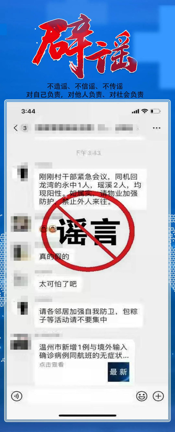 近期,有网友在微信群、朋友圈等平台称“龙湾区发现3名新冠肺炎确诊病例”,经核实,该信息不属实,龙湾区近期未出现新冠肺炎确诊病例和疑似病例,具体疫情信息以官方发布为准。