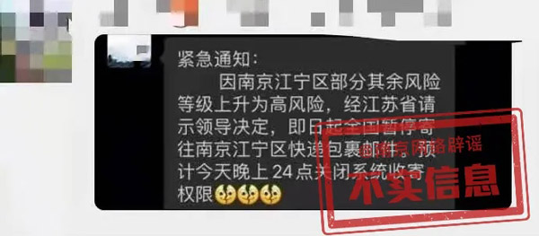 7月30日,网传关于“全国暂停寄往南京江宁区快递包裹邮件,预计今晚24点关闭系统收寄权限”的消息。