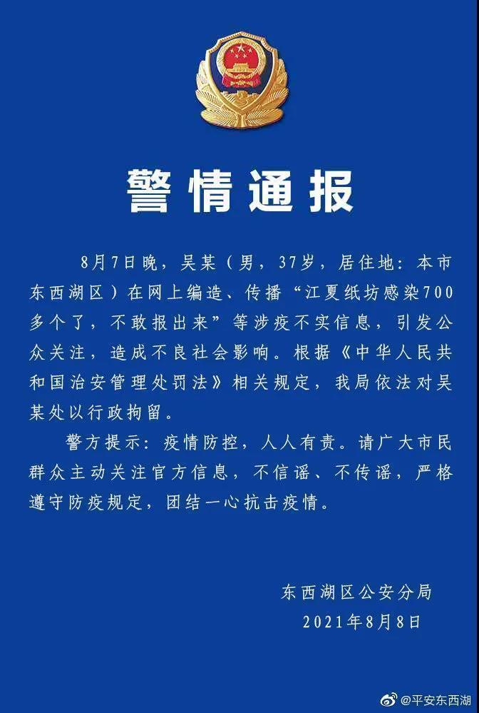 8日凌晨,武汉市东西湖区发布警情通报表示,吴某在网上编造、传播涉疫不实信息,对其依法行政拘留。全文如下: