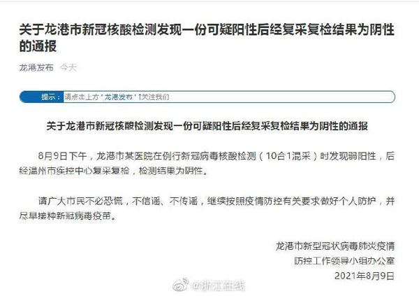 8月9日下午,龙港市某医院在例行新冠病毒核酸检测(10合1混采)时发现弱阳性,后经温州市疾控中心复采复检,检测结果为阴性。