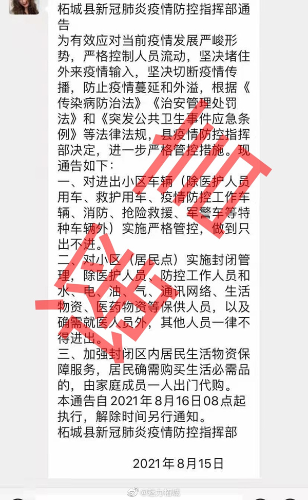 8月15日,柘城县网信办接网民举报,有人在微信群传播“对小区(居民点)实施封闭管理”相关消息,经向县疫情防控指挥部核实,该网传信息为谣言。