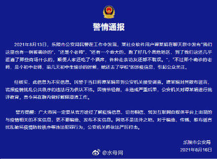 2021年8月13日,乐陵市公安局民警在工作中发现,某社交软件用户谭某娟在聊天群中发布“我们这里也有一例被确诊的”,“还是个老师”,“还有一个命大的,跑了好几个高危地区,到了我们这还几乎逛遍了那些商场什么的,顺便人家还吃了个酒席,各种走亲访友还都不耽误。”,“不过那个确诊的老师,是个初中老师,前几天初中生接诊的时候,她还去了学校”的涉疫信息,引起公众关注。经核实,此信息为不实信息。
