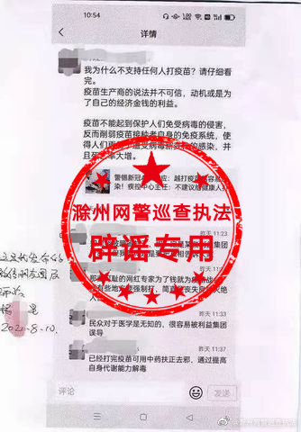 近日,全椒县公安局接网民举报,有网民在朋友圈发布涉新冠病毒疫苗谣言信息,文中称“警惕新冠ADE效应:越打疫苗越容易感染!疫控中心主任:不建议给健康人打”,“疫苗的说法并不可信……”等评论。