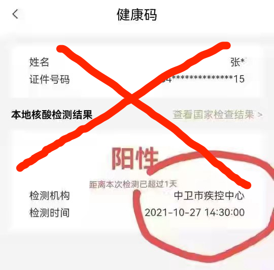 10月31日下午,中卫市多个微信群及朋友圈流传一张手机页面照片,主要内容为2021年10月27日14:30,中卫市疾控中心检测出一例核酸阳性(姓名:张*,身份证号:64**************15),经核实为虚假信息。