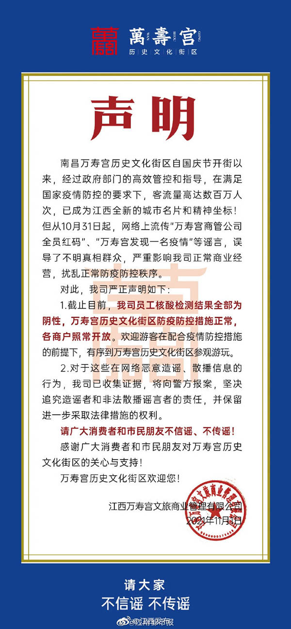 近日,江西南昌,网络上流传“万寿宫商管公司全员红码”“万寿宫发现一名疫情”等流言,11月1日,江西万寿宫文旅商业管理有限公司发布声明,辟谣相关说法,并称所有员工核酸检测为阴性,各商户照常开放。