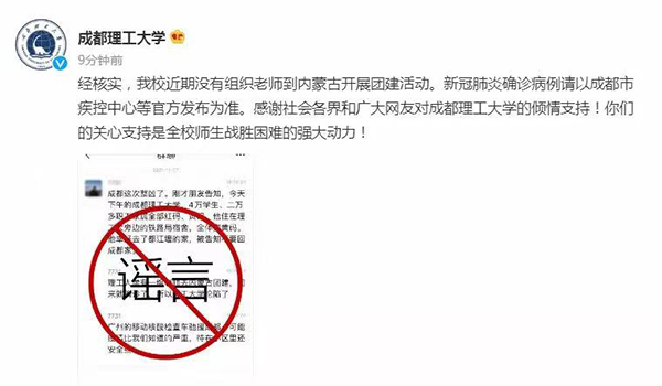 11月8日,成都理工大学通过官方微博辟谣称:经核实,成都理工大学校近期没有组织老师到内蒙古开展团建活动。新冠肺炎确诊病例请以成都市疾控中心等官方发布为准。