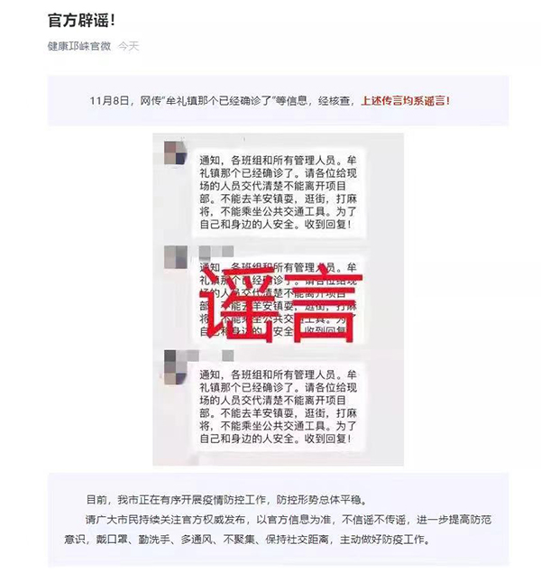 针对该传言,邛崃市卫生和计划生育局于11月8日通过官方微信公众号辟谣称:经核查,网传信息系谣言!目前,我市正在有序开展疫情防控工作,防控形势总体平稳。请广大市民持续关注官方权威发布,以官方信息为准,不信谣不传谣,进一步提高防范意识,戴口罩、勤洗手、多通风、不聚集、保持社交距离,主动做好防疫工作。